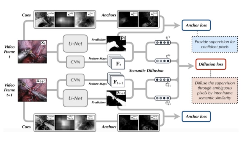 For Unsupervised Tool Segmentation, we uses handcrafted cues to generate pseudo labels. These cues include optical flow, color and location. Cues are probability maps that help us detect the presence of a surgical tool at a given pixel. After generating the three cues for each image, the element-wise multiplication of these cues give us anchors. These anchors are aggregated with the output of a U-Net to provide the anchor loss. To capture inter-frame semantic similarity, predictions from the U-Net and the output feature maps of a pre-trained CNN are aggregated to generate a diffusion loss. The goal of the unsupervised segmentation model is then to optimize the combined loss.