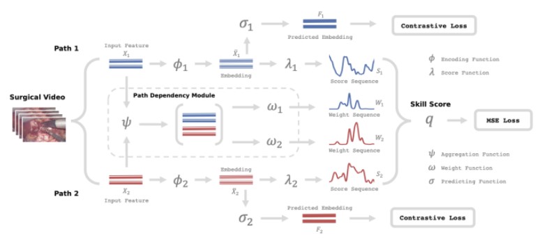 The segmentation masks are then passed as input to the multi-path Unified Skill Prediction Model for predicting how well a surgery is performed. This model proposes a unified multi-path framework for surgical skill assessment, which takes care of multiple aspects of surgical skills which include surgical tool usage, intraoperative event pattern, and other skill proxies. The dependencies among these aspects are modified by a path dependency module. Following are the three aspects considered in the model: