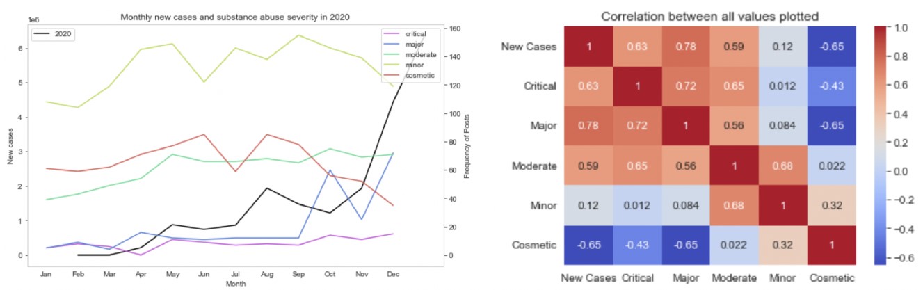 Next, we attempted to correlate the number of covid cases in a year with the number of posts classified as critical, major, moderate, minor, and cosmetic. Based on the heatmap presented below, it is evident that there exists a significant correlation between the number of new COVID-19 cases and the frequency of posts classified as critical, major, and moderate.