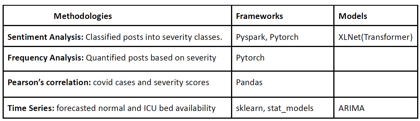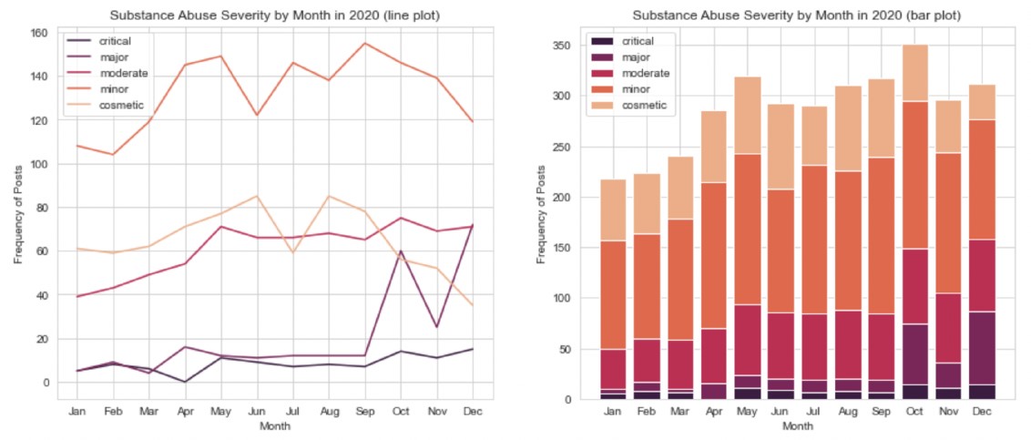 To gather our data for sentimental analysis, we utilized both existing COVID-19 Reddit datasets from 2018 to 2021 and also scraped data from 2021 to 2023 using Reddit’s open-source APIs. The data was loaded into Spark RDDs and combined, and we performed preprocessing by filtering out posts not related to mental health or substance abuse. We also used engagement scores to filter the data for better results. The XLNet model, a transformers model, was used to classify the posts into five severity score classes: critical, major, moderate, minor, and cosmetic, through a zero-shot classification pipeline.