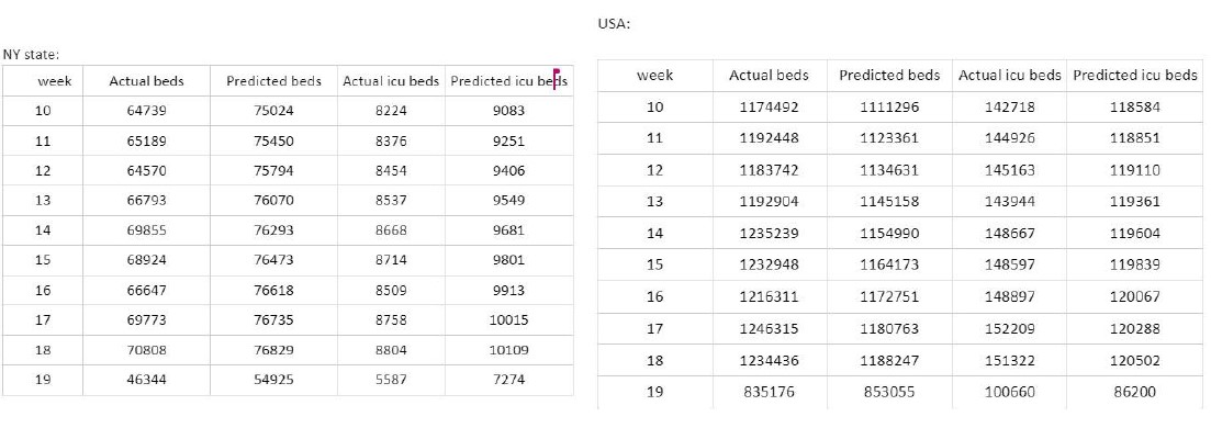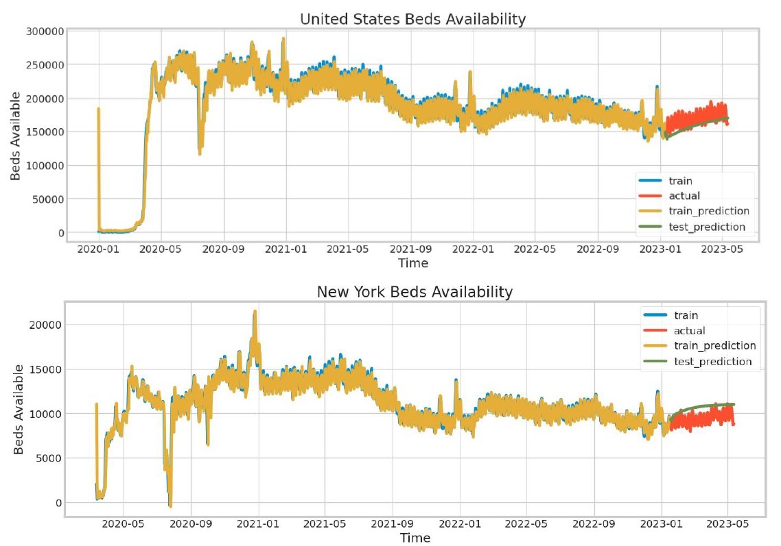 We then employed the ARIMA model, imported from statsmodels, using 90% of the data and test it against the remaining 10% for availability of inpatient and ICU beds for New York state and for the entire country. We also compared ARIMA, SARIMA and Holts models for forecasting bed availability and found ARIMA to be the best based on root mean squared error values.